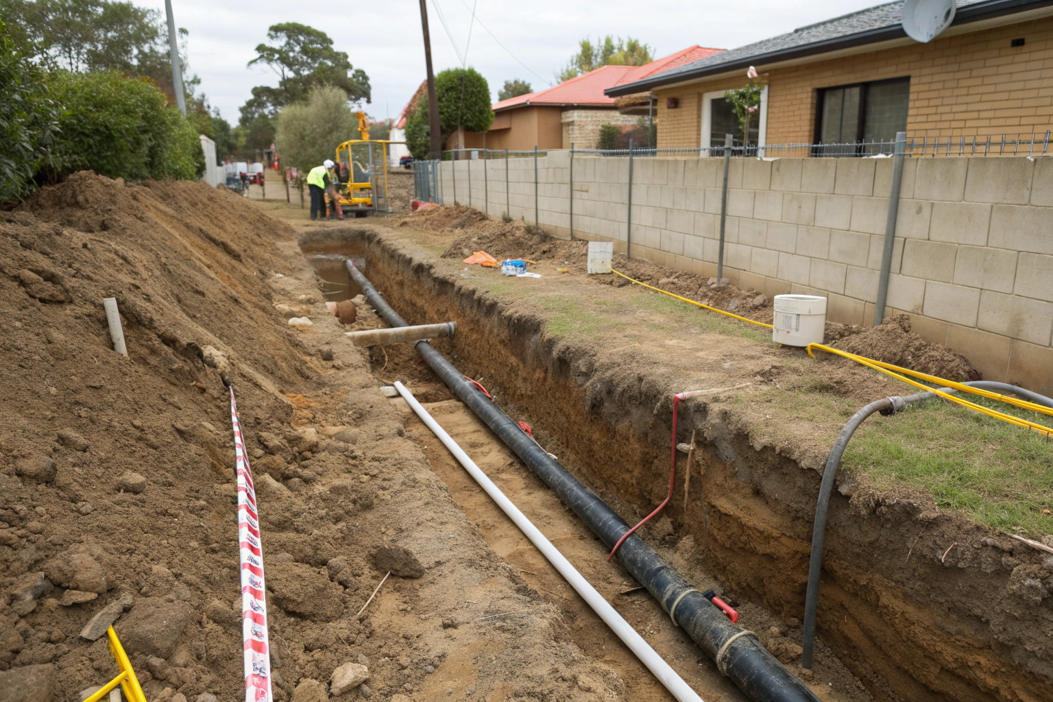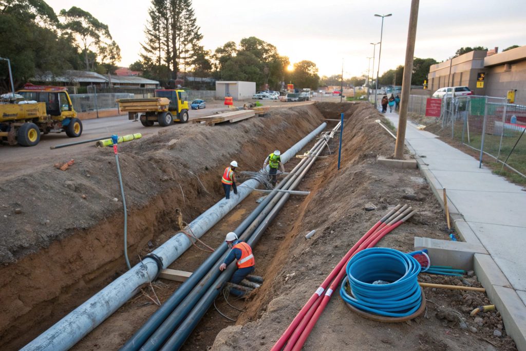 Private property trenching generally doesn’t require permits unless you’re working near easements or connecting to mains services. Work in nature strips, footpaths, driveways crossing council land, or road reserves requires council permits. Commercial projects may need additional approvals and traffic management plans.
